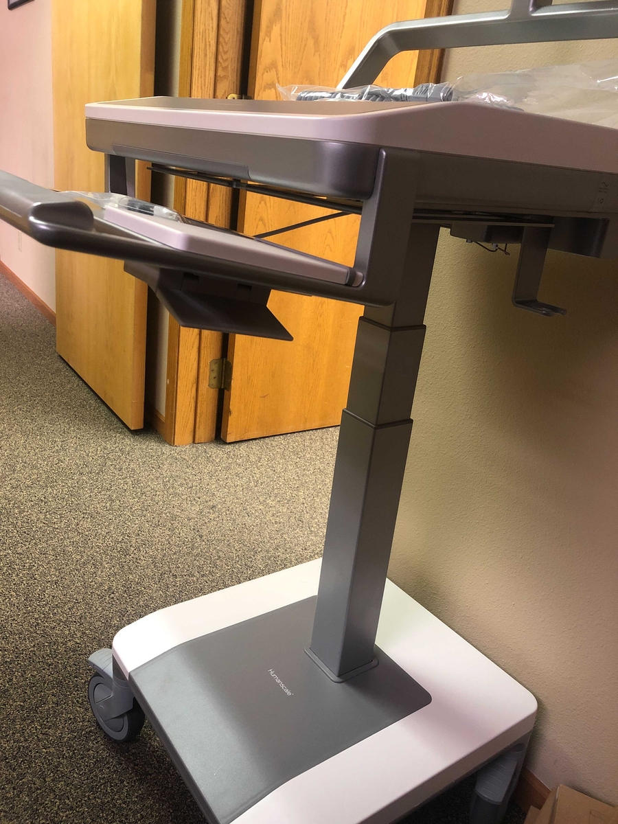 While the kiosks mounted to a cart are set up to be used in a standing position, they can also be lowered to accommodate those that cannot stand or would prefer to use the kiosk in a seated position.