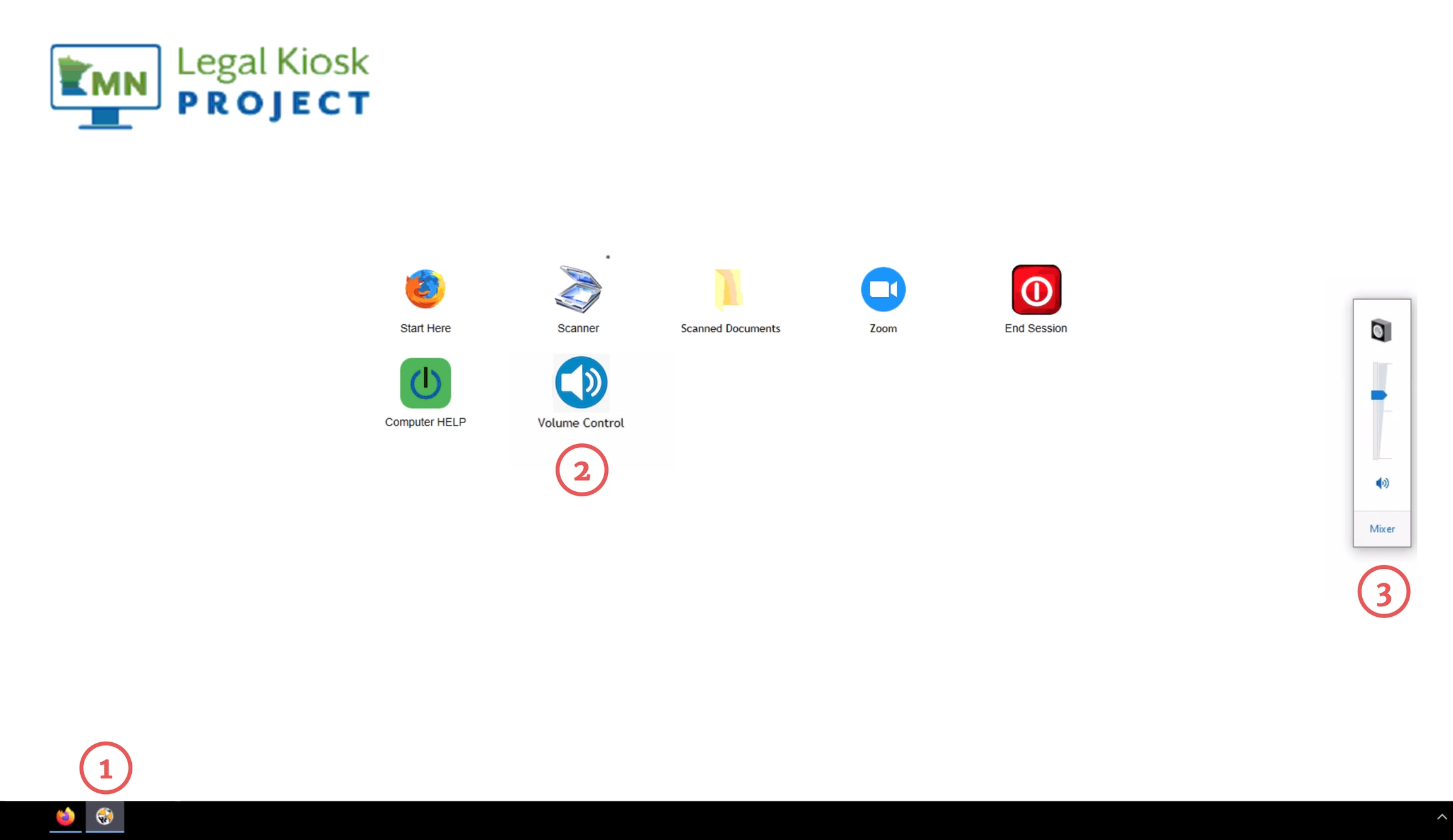 To find the volume control settings, you must minimize your open windows. Or click on the Kiosk Desktop icon in the bottom left-hand corner of the screen. The kiosk desktop icon is the right icon of the two pictured above.