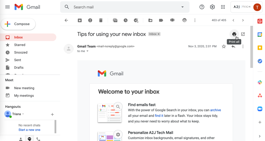 Depending on your email provider, you might be able to print with a button, or you can follow the steps above for "Printing from the web" to print everything on the page you can see.