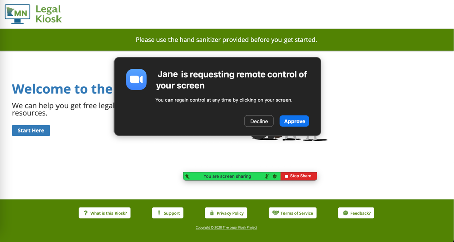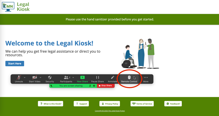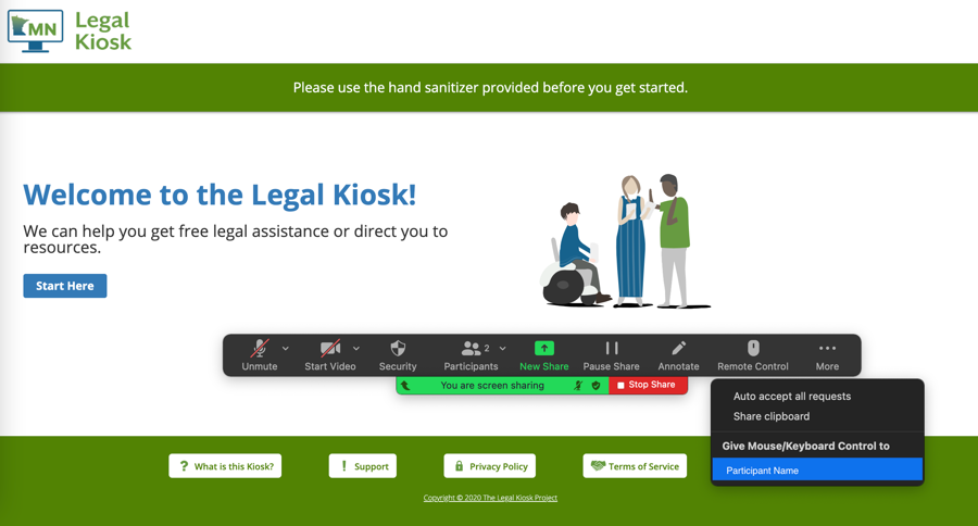 During a video meeting, you can give remote control access to your kiosk to other meeting participants. This can be very helpful when meeting with legal aid staff or an attorney, as they can view what's on your screen and help you fill out a form or navigate a challenging website.
