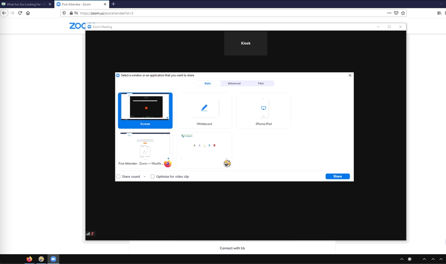 You will be asked what you'd like to share. Click on the first option "Screen" highlighted in blue. Then click Share.